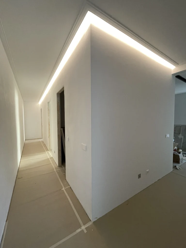 And when night falls, indirect lighting takes over: LED strips hidden in moldings, warm points of light that don’t overwhelm, and sculptural lamps that create atmosphere without overpowering the space.